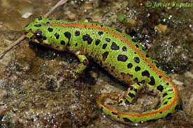 El tritón jaspeado (Triturus marmuratus) es un anfibio urodelo de la familia Salamandridae. De cuerpo robusto, y sección circular algo deprimida, con una cola comprimida lateralmente tan larga como el resto de su cuerpo más la cabeza. Esta es redondeada, ligeramente más larga que ancha con el hocico poco notorio y los labios muy desarrollados durante la época del celo. La parte superior de su cuerpo es amarillenta, con manchas de color pardo o marrón. La parte inferior, puede se de varios colores: blanca, amarillenta, grisácea o negruzca.